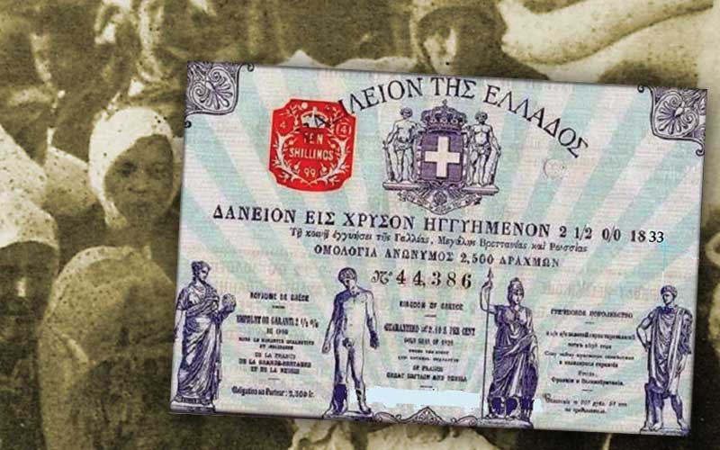αρχικό «χρέος» συνεχώς να διογκώνεται. 1821 Τα «δάνεια» του αγώνα Αμέσως μετά την έναρξη της επανάστασης του 1821 κρίθηκε αναγκαίο, να την συνέχισή της και για το αίσιο τέλος της, η προσωρινή κυβέρνηση η οποία σχηματίστηκε να συνάψει ένα δάνειο, το λεγόμενο επαναστατικό, με διάφορους τραπεζικούς οίκους του εξωτερικού, κυρίως της Αγγλίας. Στο συγκεκριμένο δάνειο εφαρμόστηκαν οι πιο σκληροί τοκογλυφικοί όροι τους οποίους δέχτηκαν οι κοτζαμπάσηδες οι οποίοι τότε εκπροσωπούσαν την χώρα με αποτέλεσμα να κρατηθούν εκτός από τα έξοδα της συμφωνίας προκαταβολικά και το σύνολο των τόκων με αποτέλεσμα το τελικό ποσόν που έφτασε στα χέρια των επαναστατημένων Ελλήνων να είναι μηδαμινό και έτσι να χρειάζεται εκ νέου δανεισμός. Η χειρότερη όμως παρενέργεια αυτής της κίνησης ήταν ό εμφύλιος πόλεμος που ξέσπασε ανάμεσα στους Μωραΐτες και Ρουμελιώτες καπεταναίους που είχε σαν αποτέλεσμα η Ελλάδα να χρειαστεί την επέμβαση (στον κόλπο του Ναβαρίνο) των Μεγάλων Δυνάμεων της εποχής για να παγιώσει την ανεξαρτησία της, κάτι που την έφερε στην θέση του προτεκτοράτου, κυρίως της Αγγλίας. 1897 Πρώτη εκχώρηση εθνικού πλούτου Με την λήξη του ατυχούς ελληνοτουρκικού πολέμου του 1897 η Ελλάδα ως ηττημένη κλήθηκε να πληρώσει στην τότε Οθωμανική αυτοκρατορία ως πολεμική αποζημίωση ένα τεράστιο ποσόν το οποίο όμως αδυνατούσε. Το ποσόν αυτό μπορούσε να βρεθεί μόνον μέσω δανεισμού κάτι που οι Μεγάλες Δυνάμεις αρνούνταν αν δεν ικανοποιούνταν πρώτα οι απαιτήσεις των ομολογιούχων που είχαν «χάσει» χρήματα λόγω της πτώχευσης του 1893. Τελικώς η Ελλάδα αναγκάστηκε να υποχωρήσει και οι Δυνάμεις επέβαλαν στην χώρα μας τον Δ.Ο.Ε. (Διεθνή Οικονομικό Έλεγχο) με σκοπό να ελέγχουν την εξυπηρέτηση του δημόσιου χρέους. Αποτέλεσμα ήταν να εκχωρηθούν στον Δ.Ο.Ε. σημαντικές πηγές εσόδων: Διάφορα κρατικά μονοπώλια, τα τέλη χαρτοσήμου, οι δασμοί των τελωνείων και ο φόρος καταναλώσεως καπνού. Ο οικονομικός έλεγχος υπήρξε βαρύτατος και διατυπώθηκε η άποψη ότι είχε σημάνει το τέλος της οικονομικής ανεξαρτησίας της Ελλάδας. Το συμφέρον όμως των δανειστών καθώς και η συνετή πολιτική του τότε πρωθυπουργού Γεώργιου Θεοτόκη έφεραν κάποια ευνοϊκά αποτελέσματα για την ελληνική οικονομία. 1915 Ο Α’ Παγκόσμίος Πολέμος Η χώρα μας αν και δεν εισήλθε αμέσως στον πόλεμο εντούτοις οι στρατιωτικές της δαπάνες αυξήθηκαν καθώς αυξήθηκε η δύναμη του στρατού και οχυρώθηκαν τα σύνορα, στα τέλη του 1915 η χώρα μας επιστρατεύεται γι.α 9 μήνες. Συνολικά οι στρατιωτικές δαπάνες για τα έτη 1914-15 και 1916 ανήλθαν στο ποσόν των 757 εκατομμυρίων δραχμών, μέρος του οποίου καλύφθηκε από το δάνειο του 1914 και με μετάθεση των πληρωμών, όμως για να αποπληρωθεί το μεγαλύτερο μέρος χρειάζονταν νέο εξωτερικό δάνειο. Παρά το ότι οι χώρες της ΑΝΤΑΝΤ επιθυμούν το αξιόμαχο του ελληνικού στρατού εν τούτοις οι Βρετανοί ανοίγουν λογαριασμό 30 εκατομμυρίων φράγκων στον οποίον θα χρεώνονται τα είδη με τα οποία εξοπλίζουν τον ελληνικό στρατό, σε ισόποσο λογαριασμό οι Γάλλοι χρεώνουν τα έξοδα για την αποστολή της Ελληνικής Μεραρχίας στην Ουκρανία και για τις αγορές από τις αποθήκες τους στην Μακεδονία, ακόμα Γαλλία και Βρετανία μας επιβάλουν να τις δανείζουμε χρήματα για τα έξοδα των στρατευμάτων που διατηρούν στην χώρα μας. Το χαρακτηριστικότερο όμως δείγμα του πως μας αντιμετώπιζαν οι σύμμαχοι είναι το ότι για όσο πολεμικό υλικό δεν 
